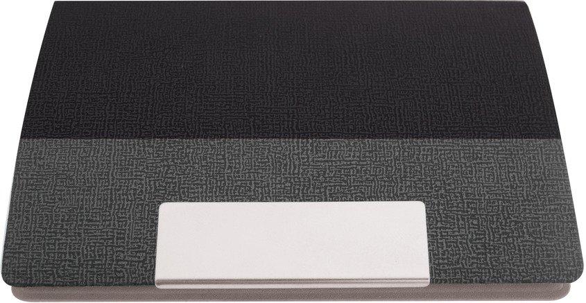 9,5 x 6,5 x 1,1 cm. Plástico y Metálico. Exterior de vinilo texturado con amplia placa metálica para impresión. Interior en metal. Cierre imantado.