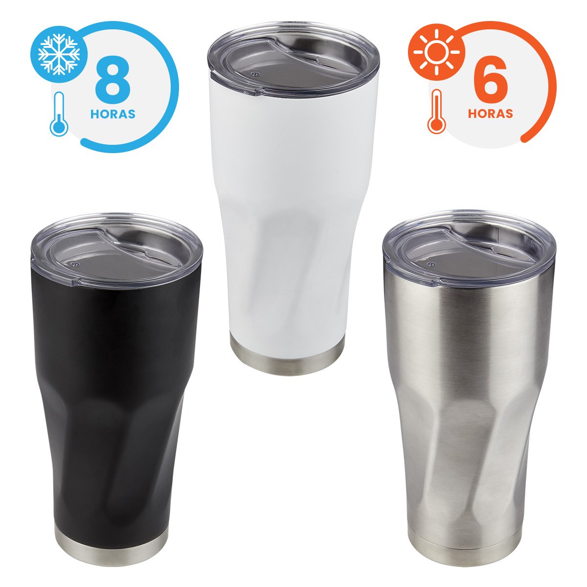 Descripción: Doble pared. Cerrado al vacío. Pared interna y externa acero inoxidable. Tapa de plástico con ranura. Mantiene temperatura caliente 6 hrs y temperatura fría 8 hrs aproximadamente. Incluye caja individual.