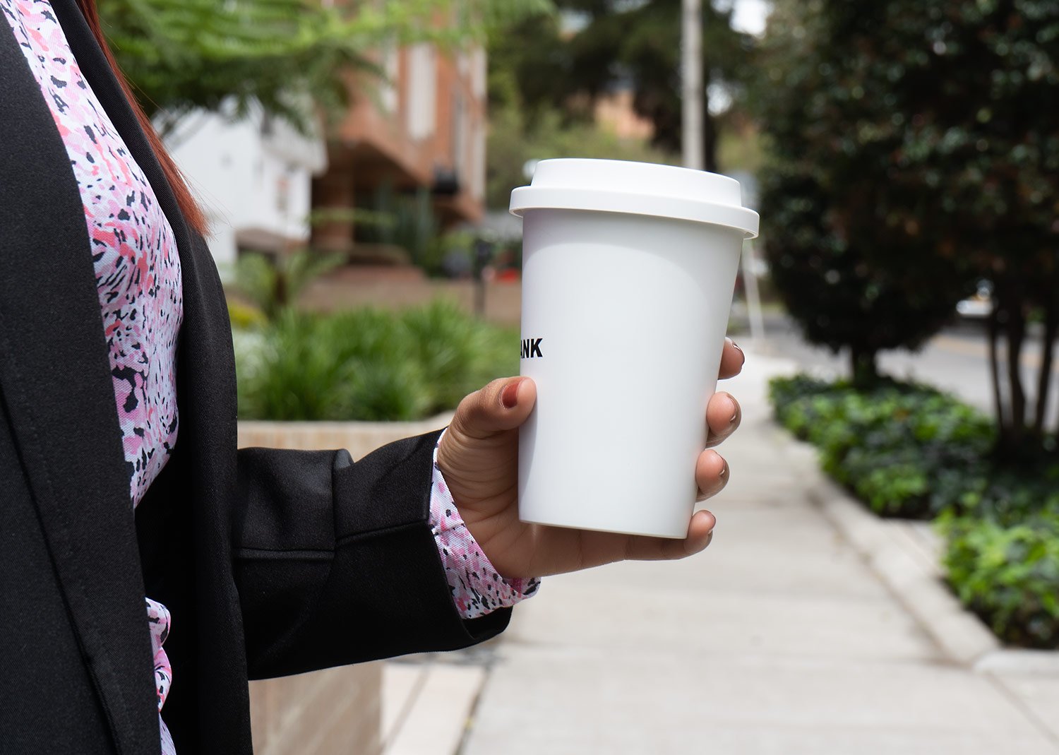Vaso para café elaborado en PLA con tapa roscada. Tiene una capacidad de 450 ml y una temperatura recomendada de ≤60℃. El PLA es un material biodegradable y compostable.