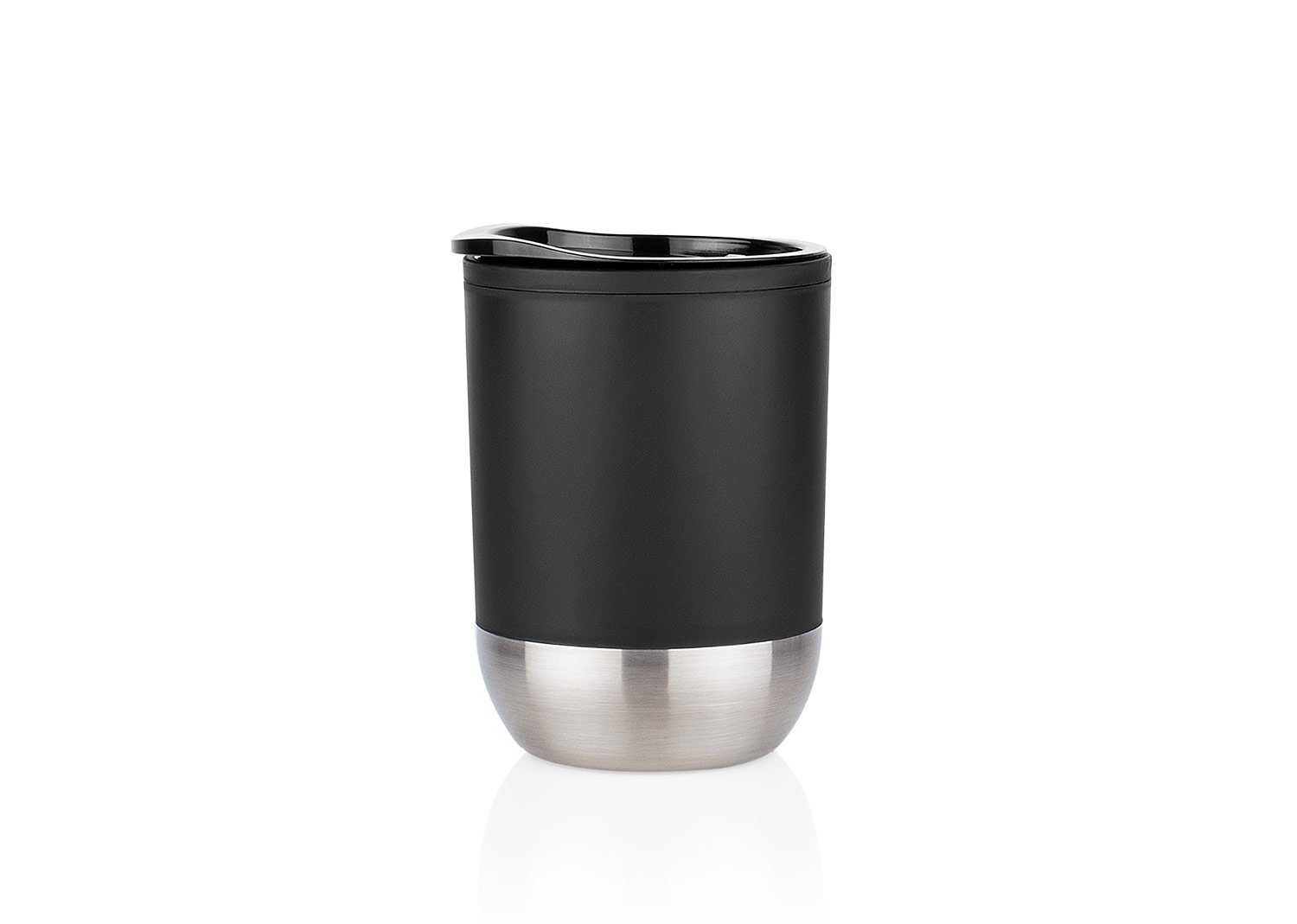 Vaso plástico para café. Resistente, con recubrimiento inferior de metal. Tapa con boquilla para deslizar con caucho en la rosca para evitar derrames. Capacidad 300 ml / 12 Oz.